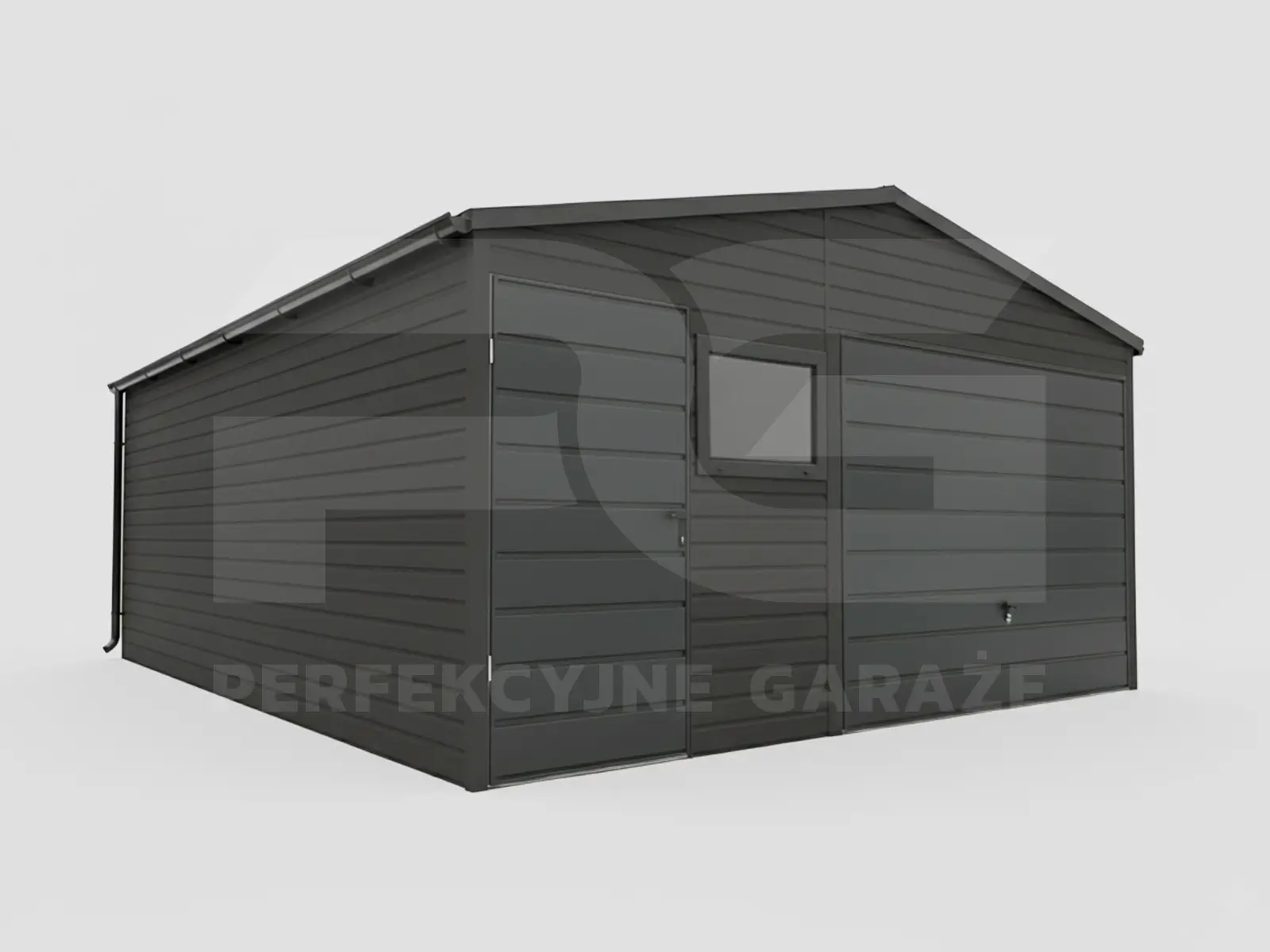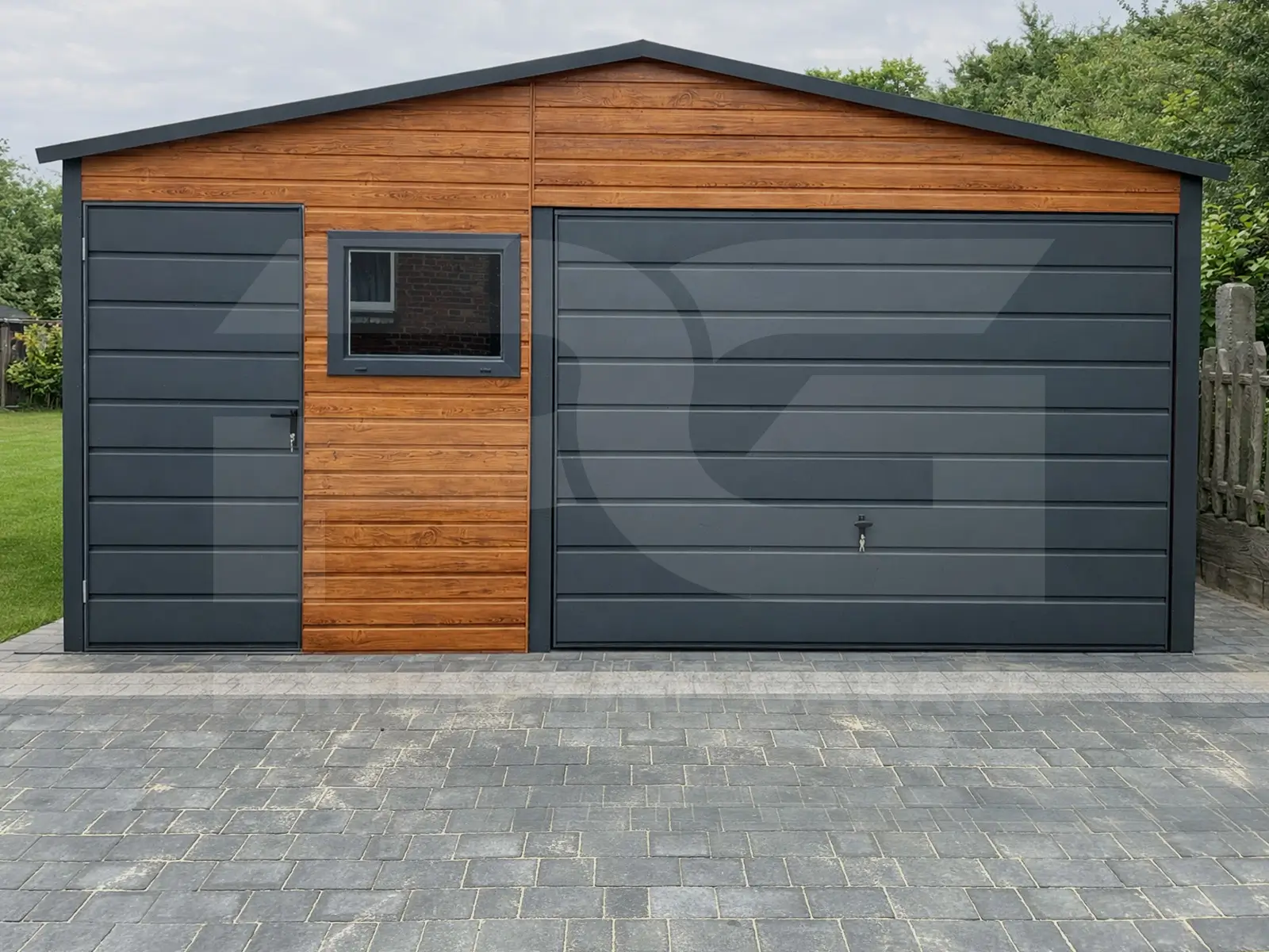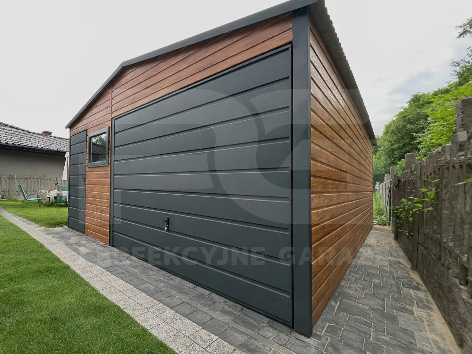- Poziomy układ blachy – na ścianach i na bramie, dlatego całość wygląda spójnie; jednocześnie ustawisz układ pod zamówienie.