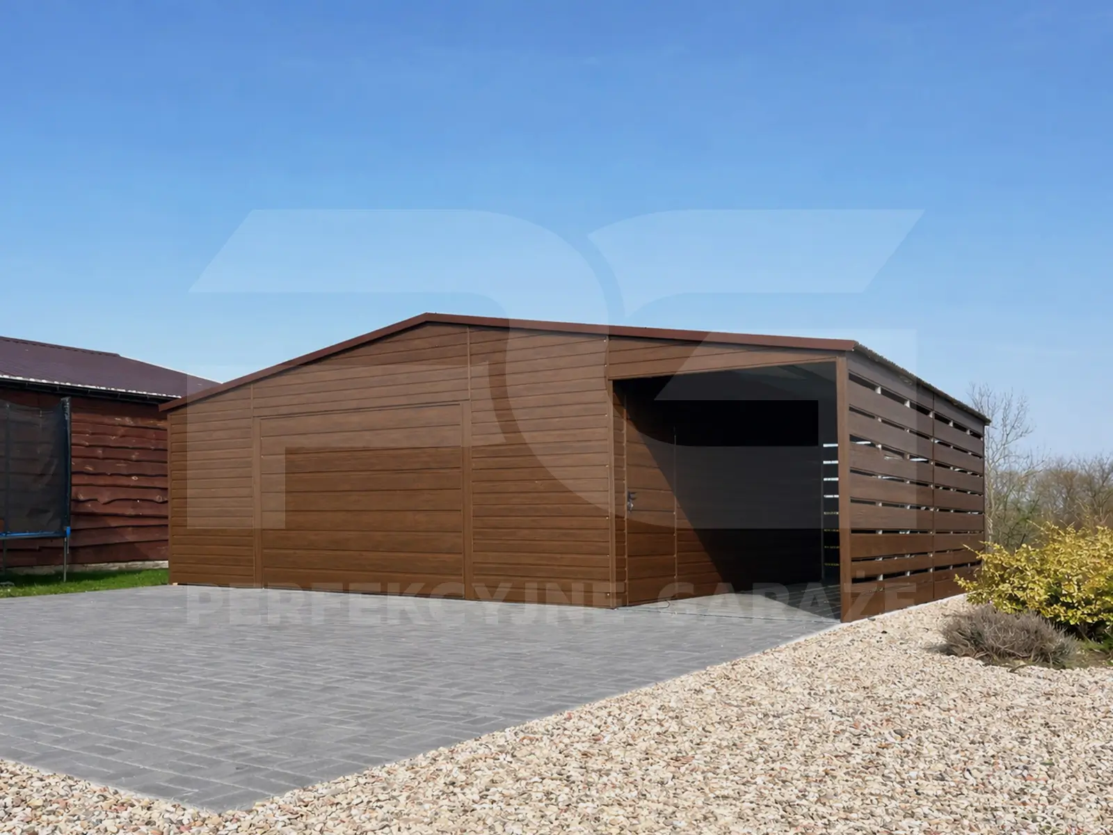 Garaż blaszany 6 x 6 Premium z wiata ażurową 2 x 6 orzech