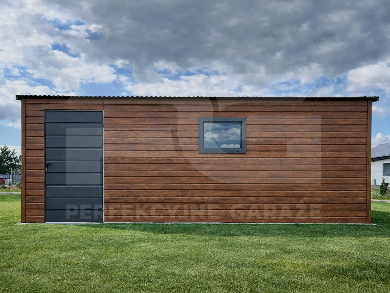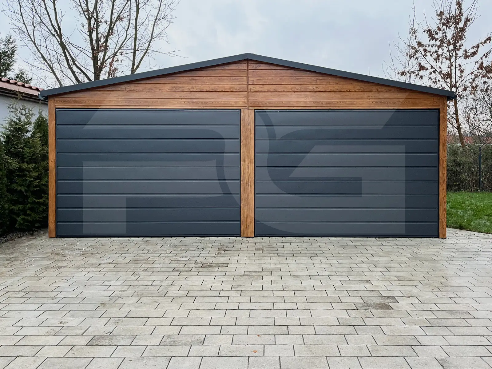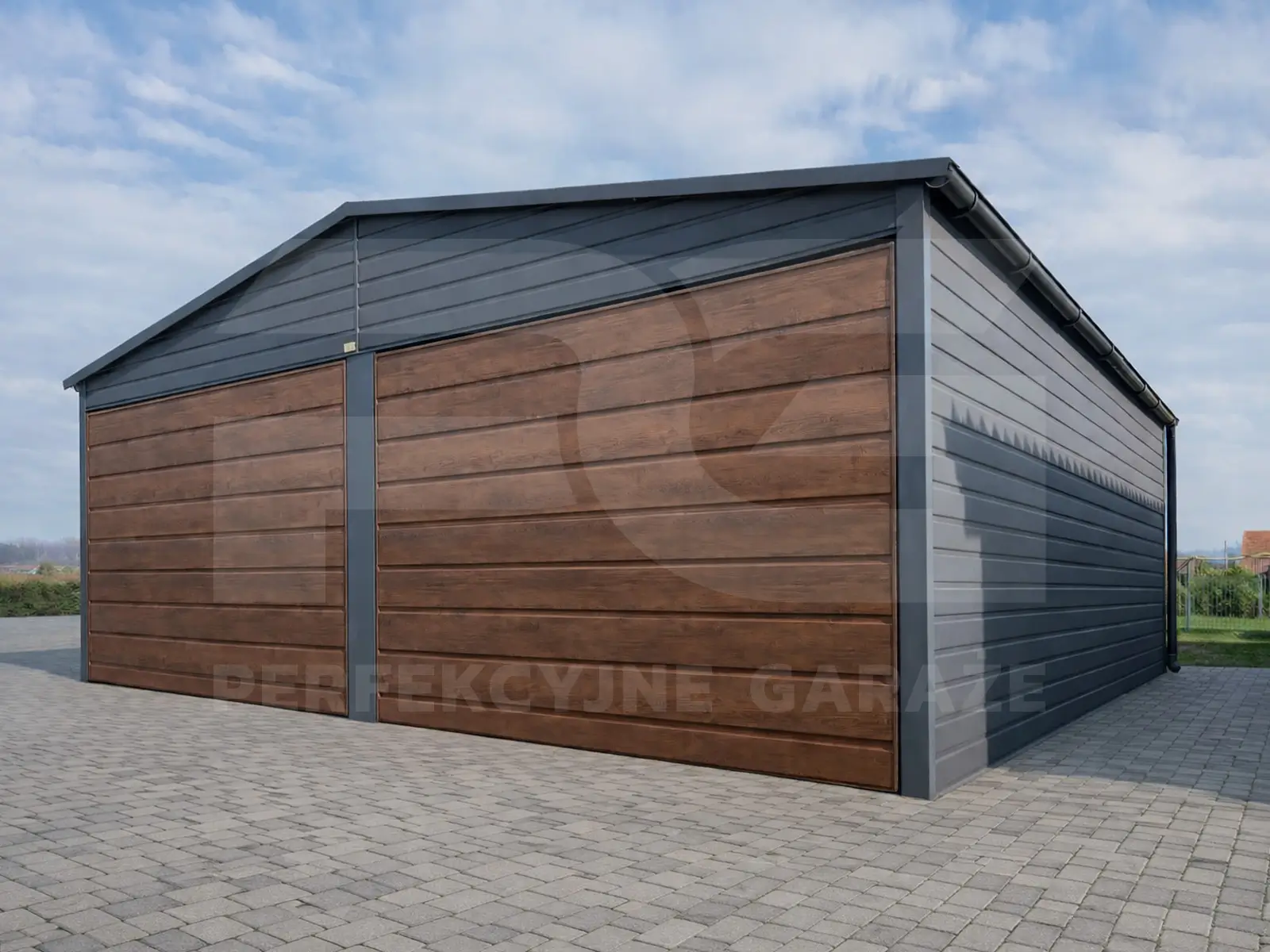 - Poszycie w układzie poziomym – na ścianach i bramie, dlatego bryła wygląda równo i nowocześnie; jednocześnie dobierzesz konfigurację pod zamówienie.