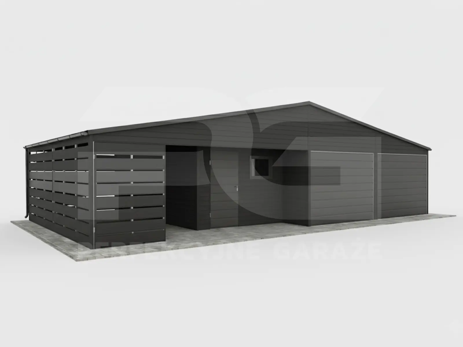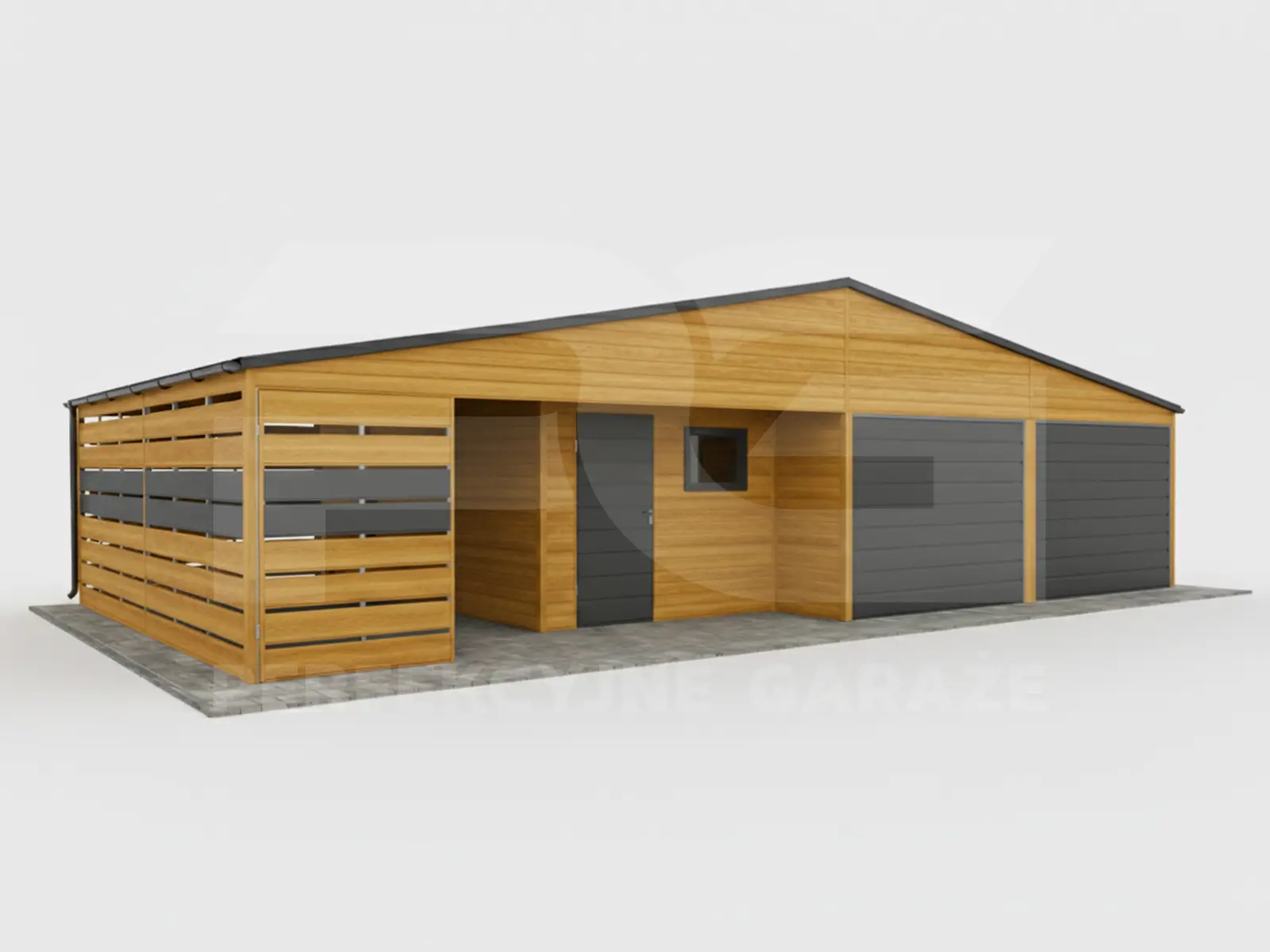 Trzy strefy w jednej bryle – część garażowa 9 × 6 daje komfort parkowania i przechowywania, natomiast wnęka pomaga uporządkować narzędzia, opony oraz chemię samochodową. Dodatkowo wiata ażurowa 3 × 6 tworzy zadaszone miejsce na drewno, rowery albo sprzęt ogrodowy.