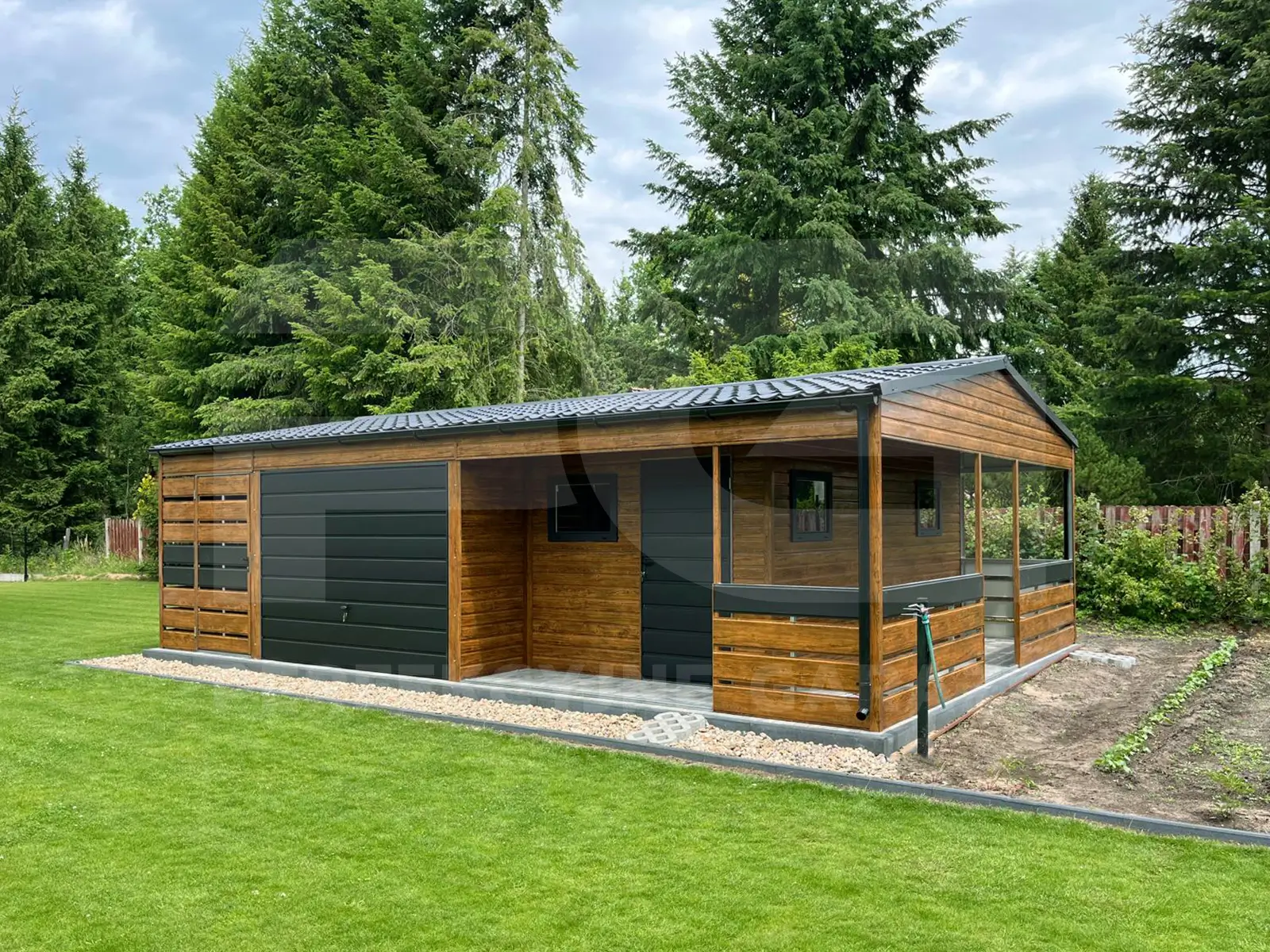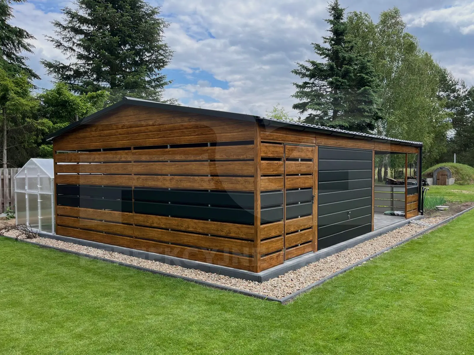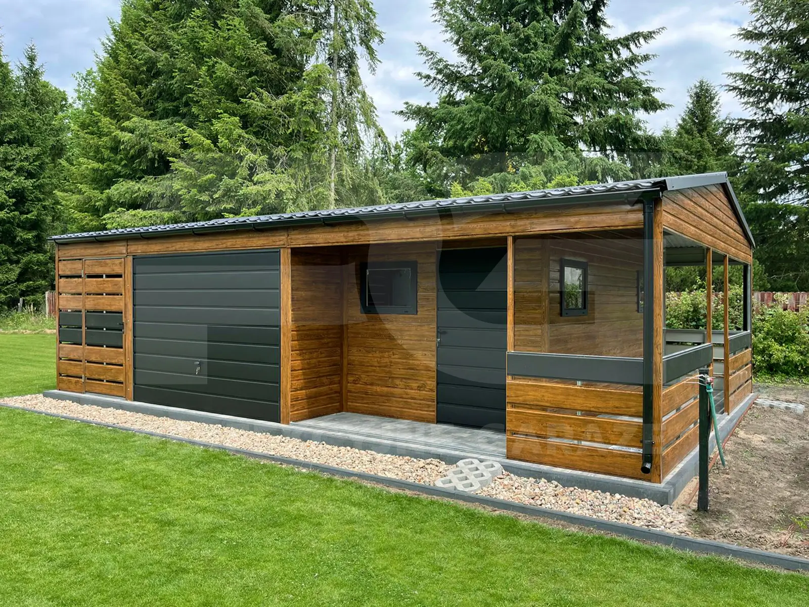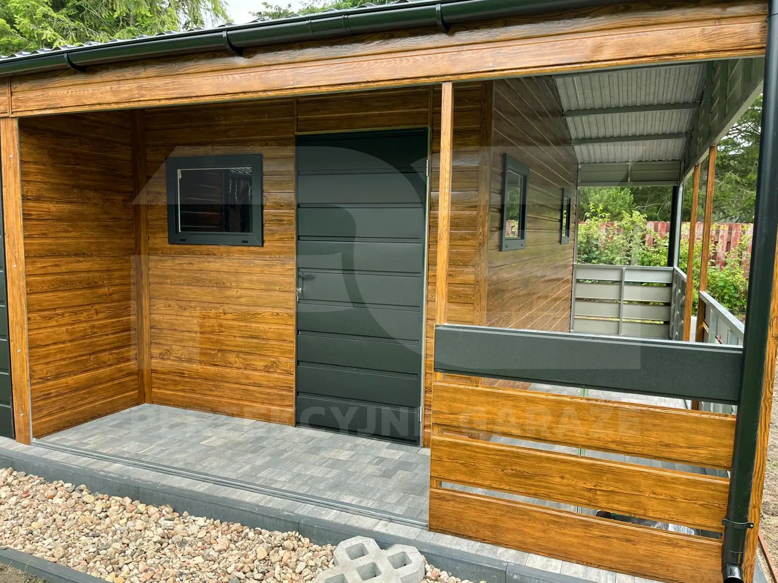 Garaż blaszany z wnęką 8.8 x 6.15 oraz wiatą ażurową i werandą