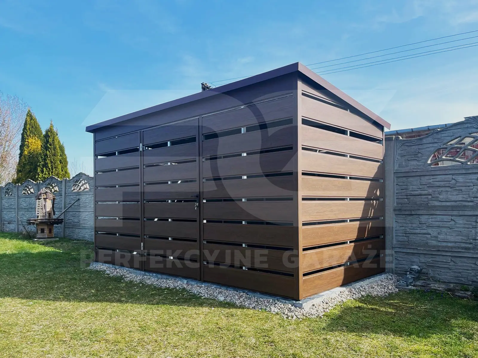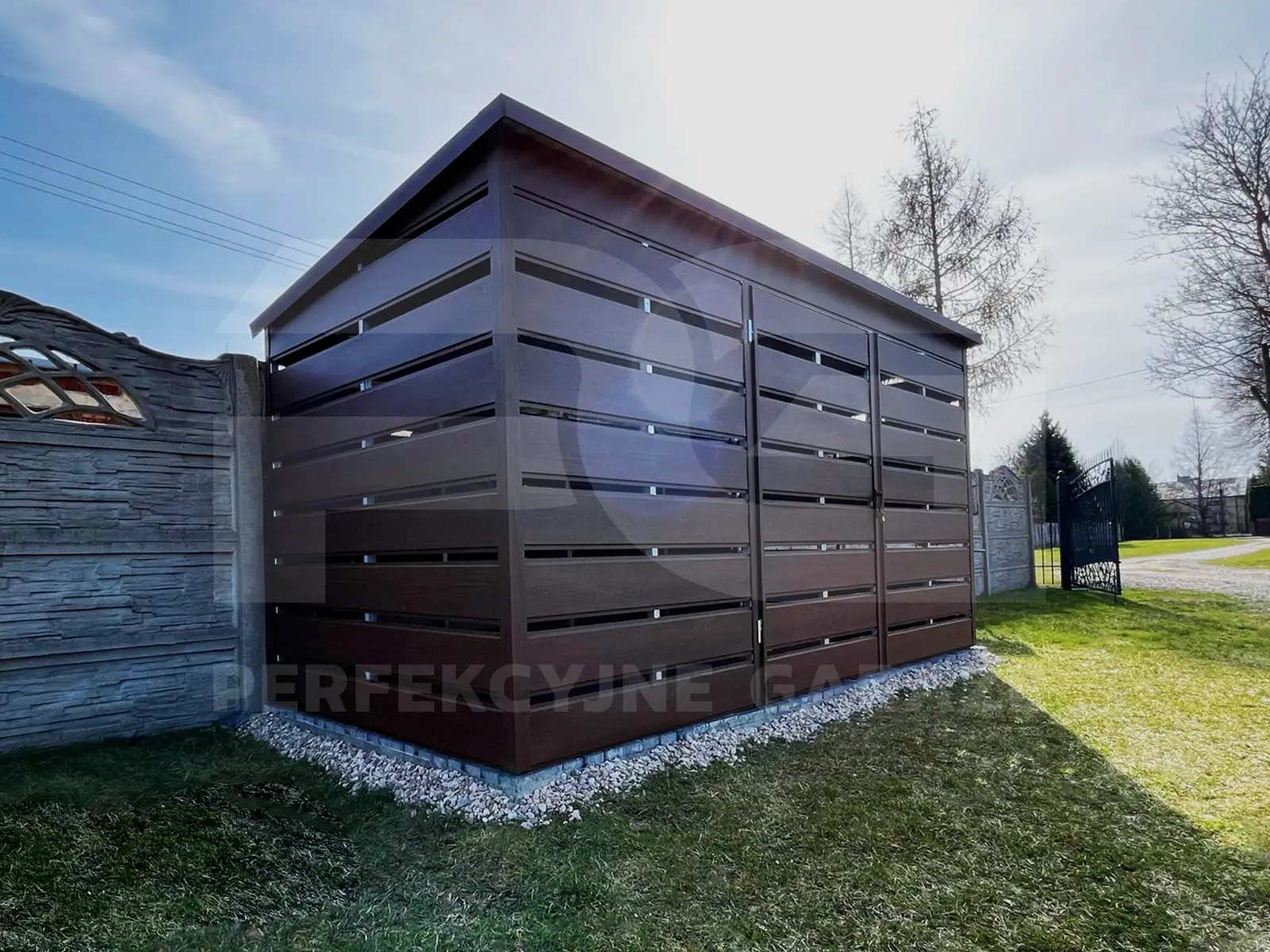 Szeroka brama wejściowa zapewnia wygodny dostęp do wnętrza wiaty, ponieważ umożliwia swobodne manewrowanie nawet większymi pojemnikami.