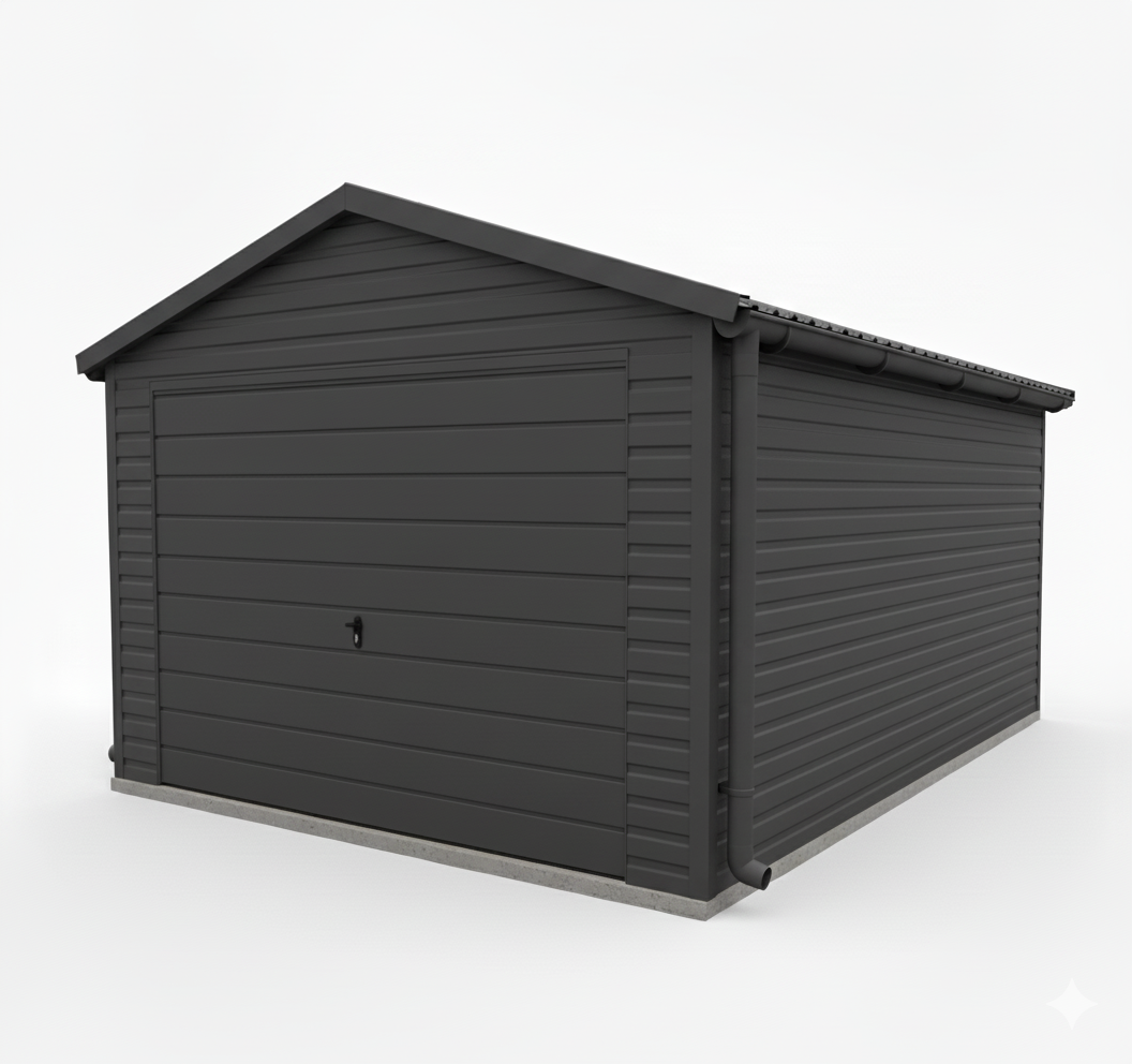 Szkielet  garażu wykonany jest z profilu zamkniętego ocynkowanego, mocowanie blach odbywa się wkrętami/nitami w kolorze blachy.