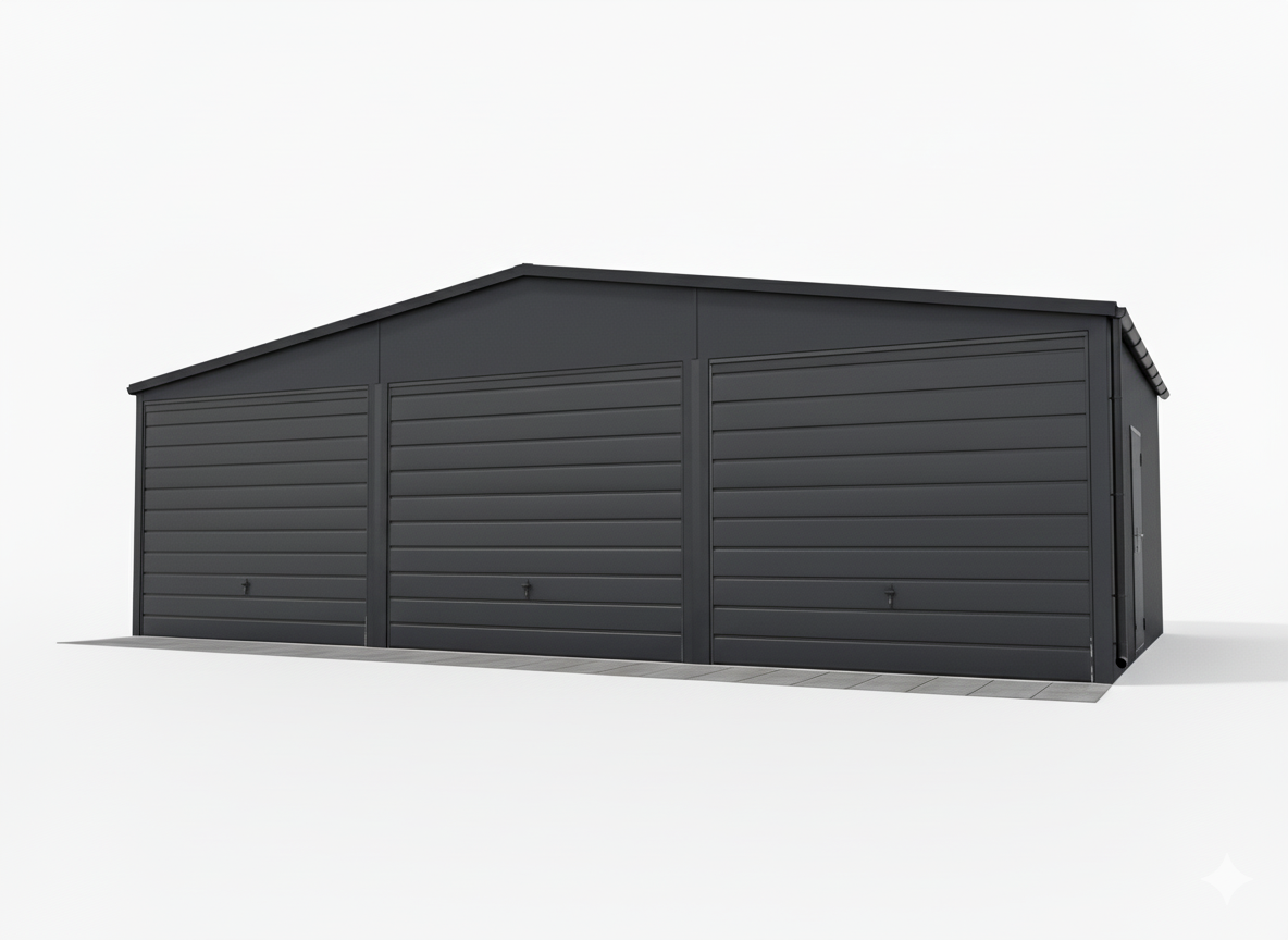 Garaż blaszany klasy PERFECT o wymiarach 9m x 5m podwójny z pomieszczeniem gospodarczym.